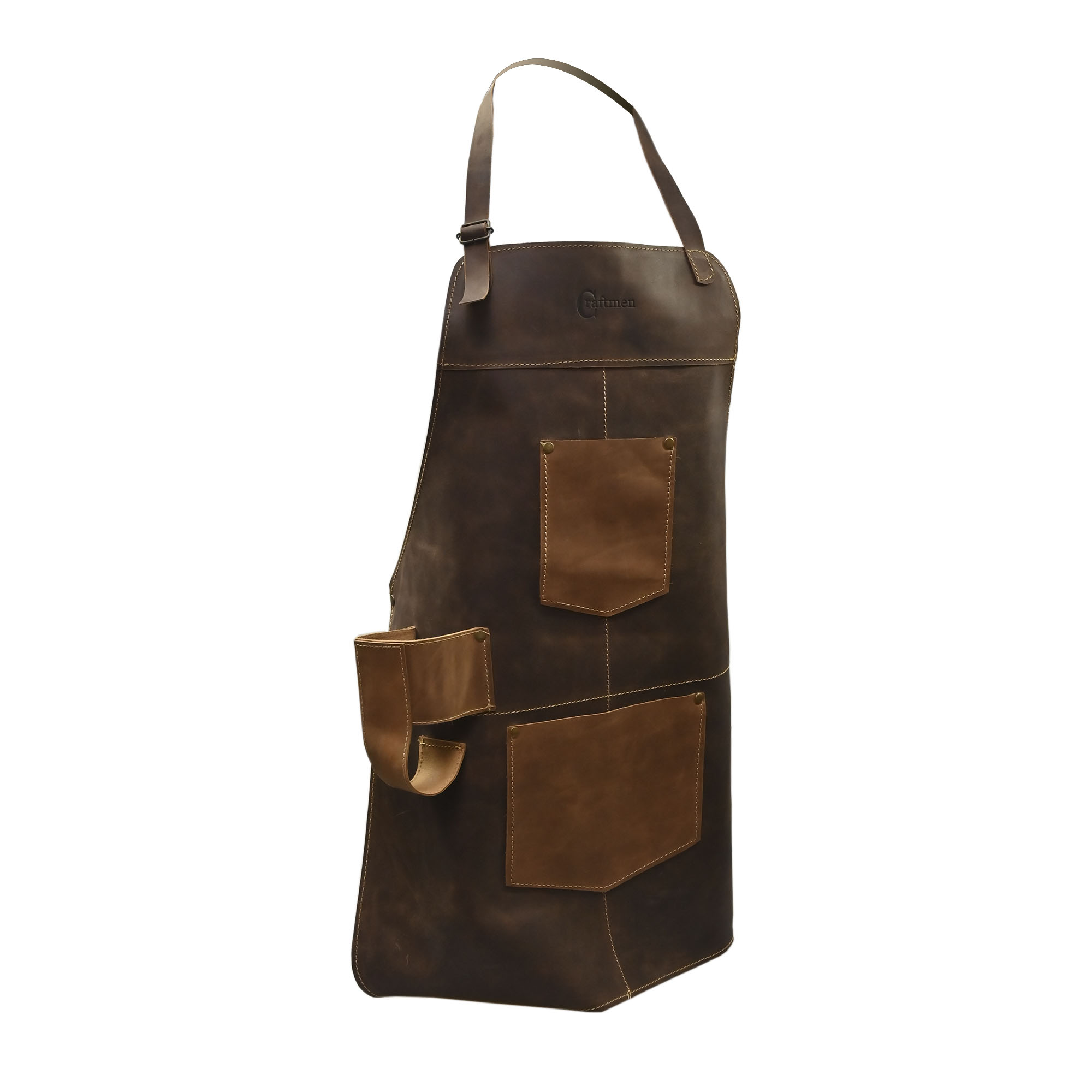 Descubre la versatilidad y estilo con nuestra Pechera 100% Cuero Genuino en un cautivador tono café claro de la marca Craftmen. Equipada con compartimentos diversos, esta pechera no solo realza tu look de asador, sino que también ofrece funcionalidad incomparable. Con espacio para celular, bebida y cuchillo, es la compañera perfecta para aventuras cotidianas. Además, se presenta de manera sostenible en una bolsa reciclable.
